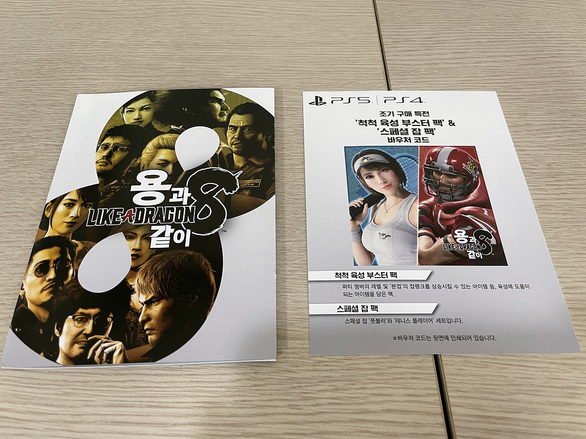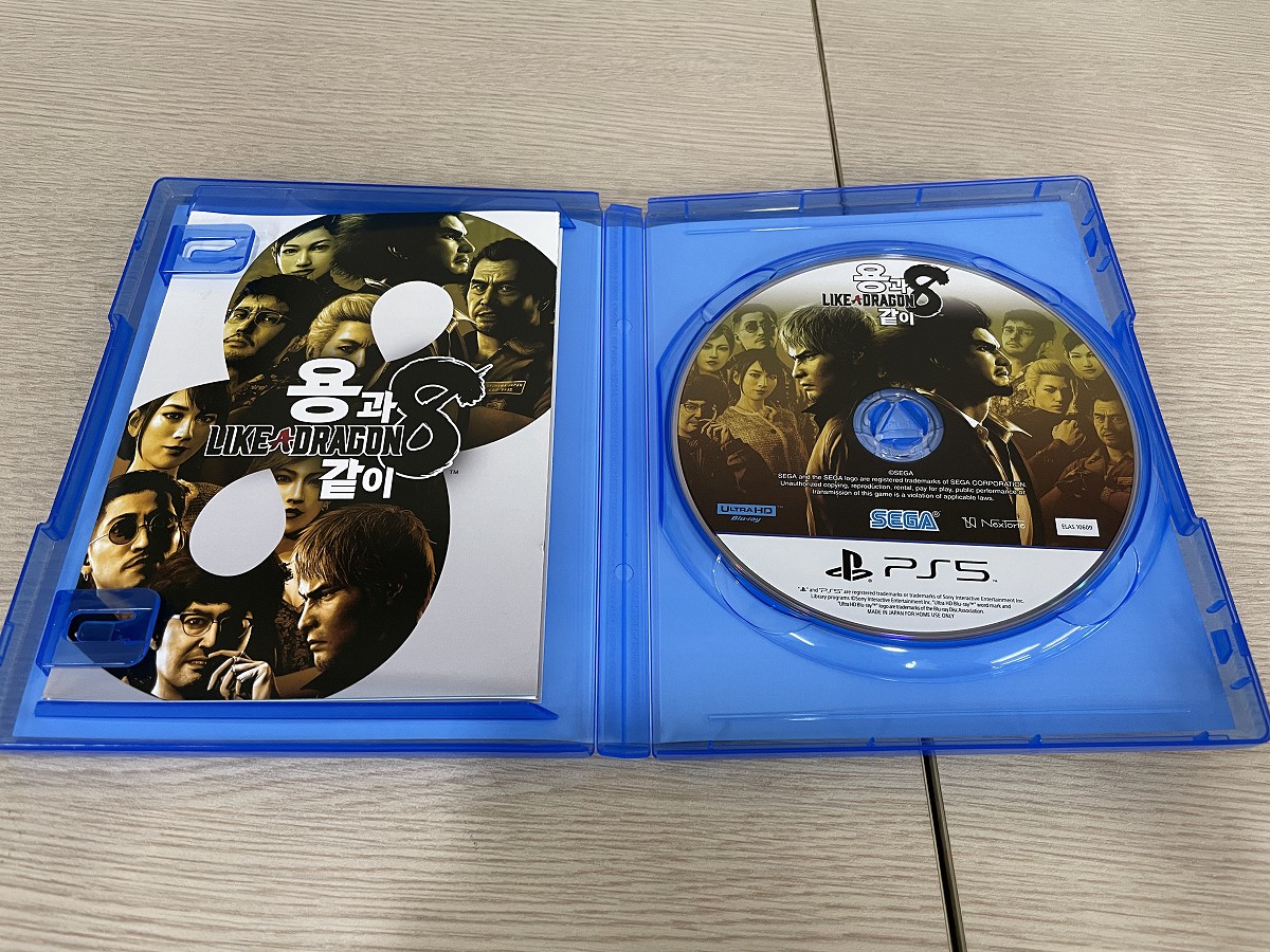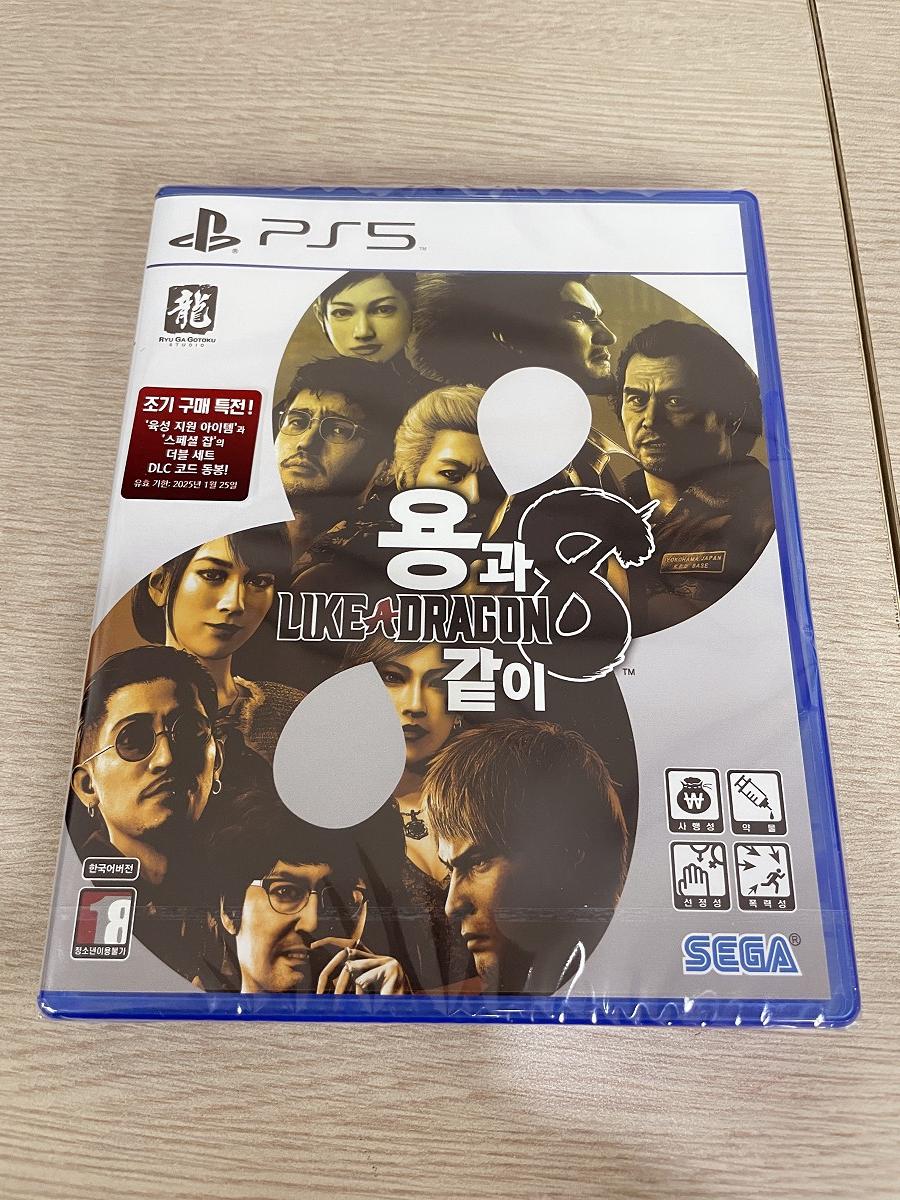 2024년을 여는 첫번째 대작으로 선택한, 용과 같이8. 7외전과 7을 클리어하면서 이 게임을 즐길 대비를 했으니 발매일에 구매하는 것은 당연한 수순이라 하겠다. 그러고보니 7외전에 이어 발매일에 맞춰 구매한 용과 같이 시리즈인 듯. 의외로 패키지 일반판의 틴케이스 등의 특전이 따로 있는 것 같지는 않았고, 케이스 안에 조기구매 특전이 제공되는 코드가 포함되어 있었다.