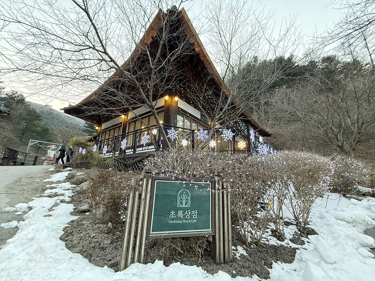 물론 해가 지기 전에는 조명 효과가 좋은 곳과 덜한 곳이 있긴 했지만, 해가 뉘엿뉘엿 져 가는 시간이었던지라 대략 어떤 느낌의 불빛들이 있겠구나 하고 예상할 수 있는 시간을 보내며 수목원을 쭉 돌다 보니, 몸도 카메라(...)도 쉬어갈 필요가 느껴지는 시간이라, 가장 안쪽에 있던 카페에서 잠시 쉬었다 가기로 했다. 그리고 이대로 해가 지기를 기다리면...