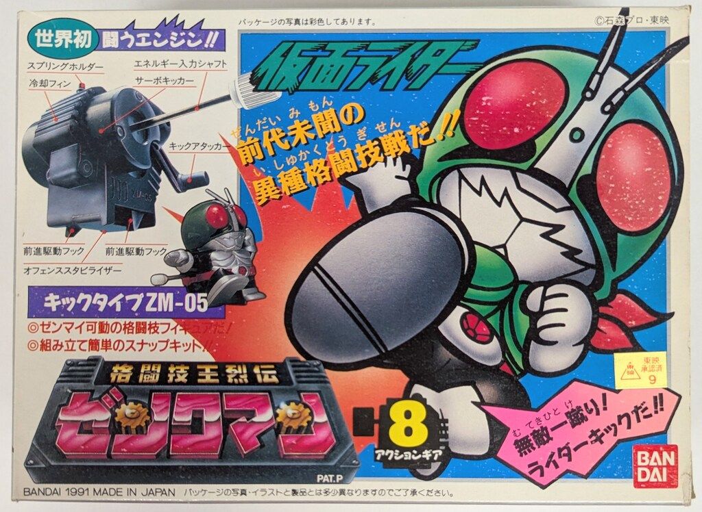 대략 중학교 때 쯤으로 기억하는데, 통학로에서 순진한 학생들을 유혹하던 문방구의 진열 아이템 중에 다소 생소한 아이템을 발견했었다. 당시 일본어를 전혀 읽지 못했던 나도 그랬지만 들여놓은 문방구 아저씨도 이 제품의 이름을 제대로 알지 못했다. 여기 소개하는 아이템은 8번 가면라이더 였는데, 당시 내가 구매했던 건 3번으로 기억하는 건담 NT-1 알렉스였고, 동생이 구매한 건 2번으로 기억하는 고지라였더랬다. 아무튼, 매뉴얼에 큼지막하게 써있던 알파벳표기 ZENKUMAN 이라는 걸 보고 막연히 '젠쿠맨'쯤 되는 건가.. 하고 생각했더랬다. 아무튼, 가타가나 표기ゼンクマン를 존중하면 대충 [젠쿠만] 또는 [젠쿠맨] 정도로 읽으면 되는 것 같기도 하고.