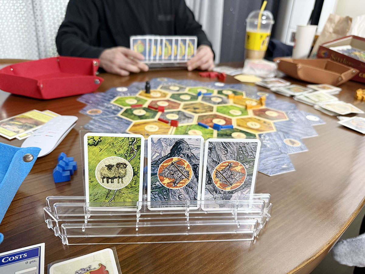 1999년인지 2002년인지 확실치 않은데, 이 카탄은 당시 보드게임의 매력에 눈을 뜬 후배가 추천하여 함께 가본 보드게임 카페에서 처음 만나본 보드게임으로 기억한다. 나는 어릴 때 죨리게임 많이 해봤지.. 하면서 따라가서 배워봤는데, 시간에 비례하는 요금이 생각보다 높아서 시간에 신경쓰느라 게임에 제대로 몰입하지 못했던 기억이 난다. 하지만 확실히 배우기 쉽고 재미있어서, 다음번에 각잡고 해봐야겠다... 라고 생각했었더랬다. 그리고, 그 다음번이 대략 20수년 뒤의 우리집일 줄은 또 절대로 몰랐었지만.