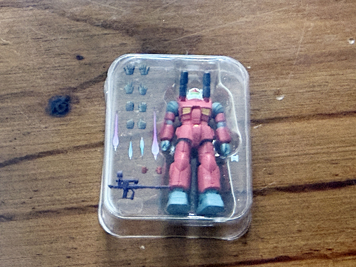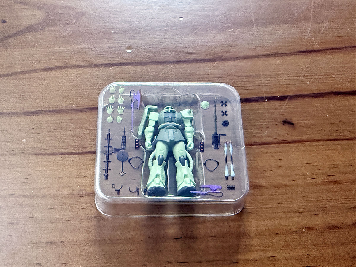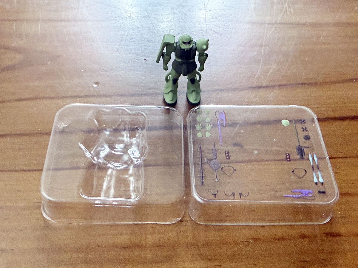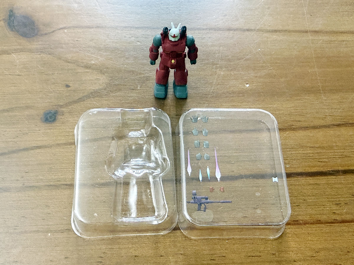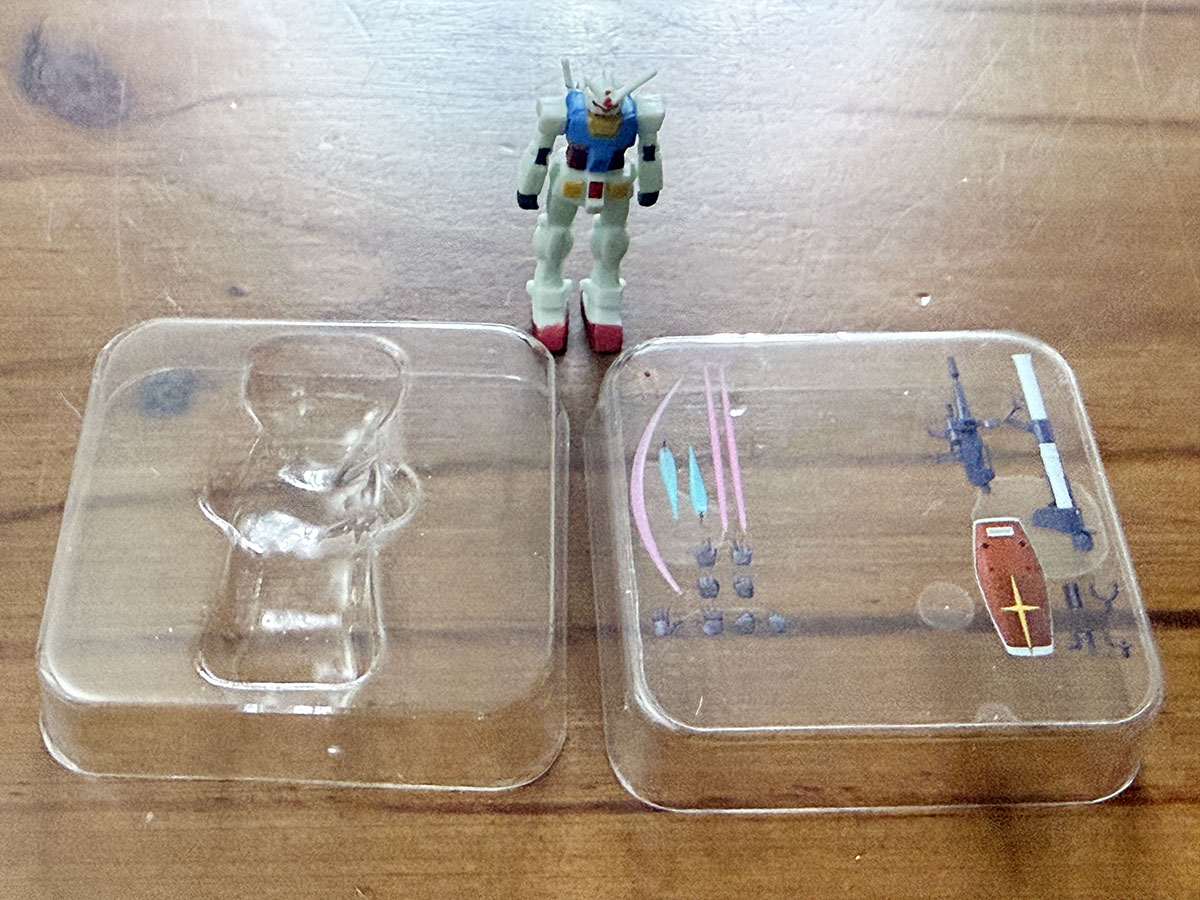 약간 납작한 타원형 캡슐이라는 특이한 캡슐에 들어있으며, 4가지 색으로 구분되어 있는 캡슐이 해당 색으로 유추할 수 있는 내용물로 구성되어 있다. 파란색은 건담, 빨간색은 건캐넌, 귤색은 샤아전용 자쿠2, 녹색은 양산형 자쿠2라는 느낌으로. 종이박스는 얇고 작은 테이핑이 되어 있어, 아트나이프로 조심스럽게 커팅하고 박스를 열면 구성물을 꺼내볼 수 있다. 무려 그럴듯한 블리스터를 볼 수가 있는데...
