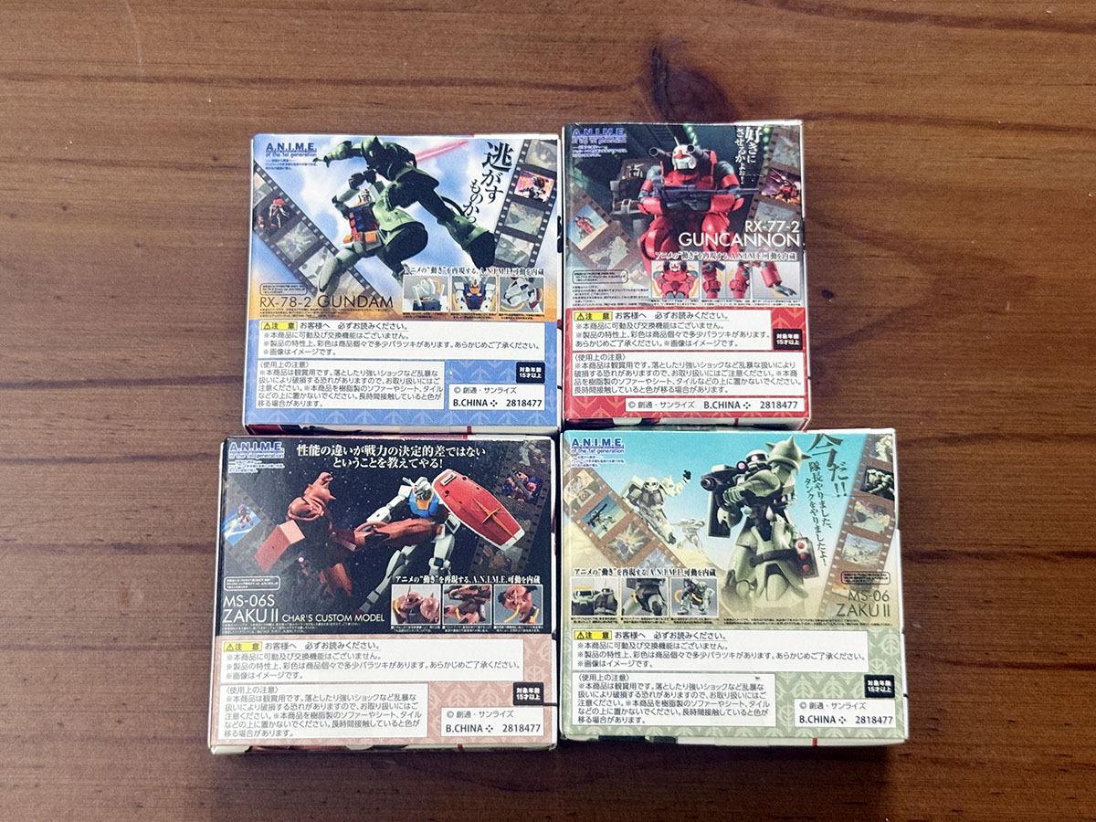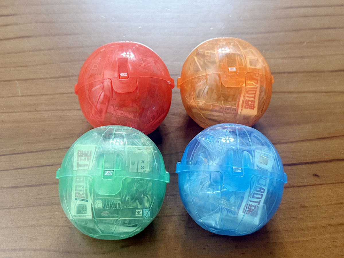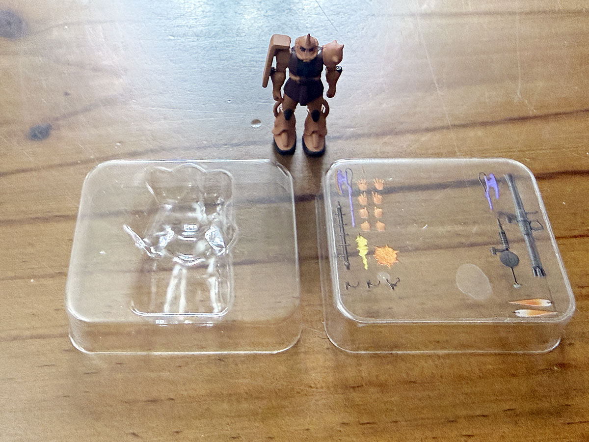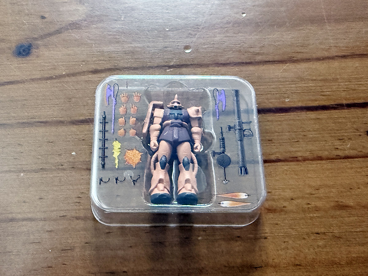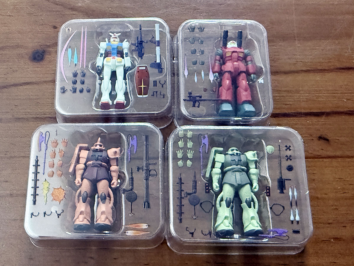 약간 납작한 타원형 캡슐이라는 특이한 캡슐에 들어있으며, 4가지 색으로 구분되어 있는 캡슐이 해당 색으로 유추할 수 있는 내용물로 구성되어 있다. 파란색은 건담, 빨간색은 건캐넌, 귤색은 샤아전용 자쿠2, 녹색은 양산형 자쿠2라는 느낌으로. 종이박스는 얇고 작은 테이핑이 되어 있어, 아트나이프로 조심스럽게 커팅하고 박스를 열면 구성물을 꺼내볼 수 있다. 무려 그럴듯한 블리스터를 볼 수가 있는데...