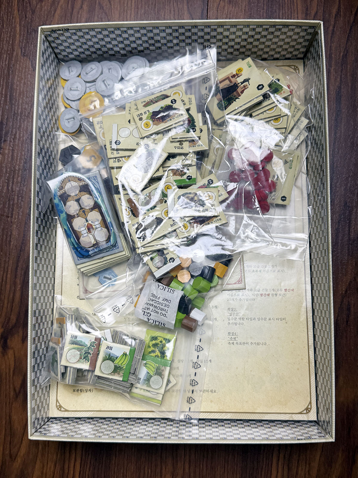 아마도, 어느 작은 보드게임 모임의 2025년 최고의 게임으로 선정될...듯한, 고전명작 푸에르토리코. 보드게임 모임을 한다곤 하지만 상당히 가볍게 즐기는 편인데, 가벼운 게임들에 만족하지 말고 조금은 세팅에 시간이 걸리더라도 게임을 즐겨보자는 제안을 해 온 멤버가 숙고하여 구매하여 시도해 본 게임. 보드게임을 좋아한다고 떠들긴 했으나 실제로 그리 조예가 깊진 않아서 몰랐는데.. 이 게임은 이미 이 바닥에서는 너무나 유명한 게임이더라. 2025년 가을 시점에서 구한다면 확장 1~4가 포함된 이 [푸에르토리코 1897]을 구매하는 것이 최선인...것 같다.